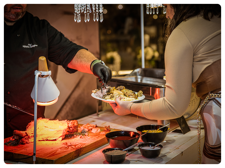 Με εμπειρία και αγάπη για το ποιοτικό φαγητό, δημιουργούμε ξεχωριστά γαστρονομικά σύνολα που αντικατοπτρίζουν τη δική σας αισθητική. Από μικρές, ιδιωτικές συγκεντρώσεις έως μεγάλες, απαιτητικές εκδηλώσεις, η ομάδα μας βρίσκεται δίπλα σας για να μετατρέψει κάθε στιγμή σε μια μοναδική γαστρονομική εμπειρία.